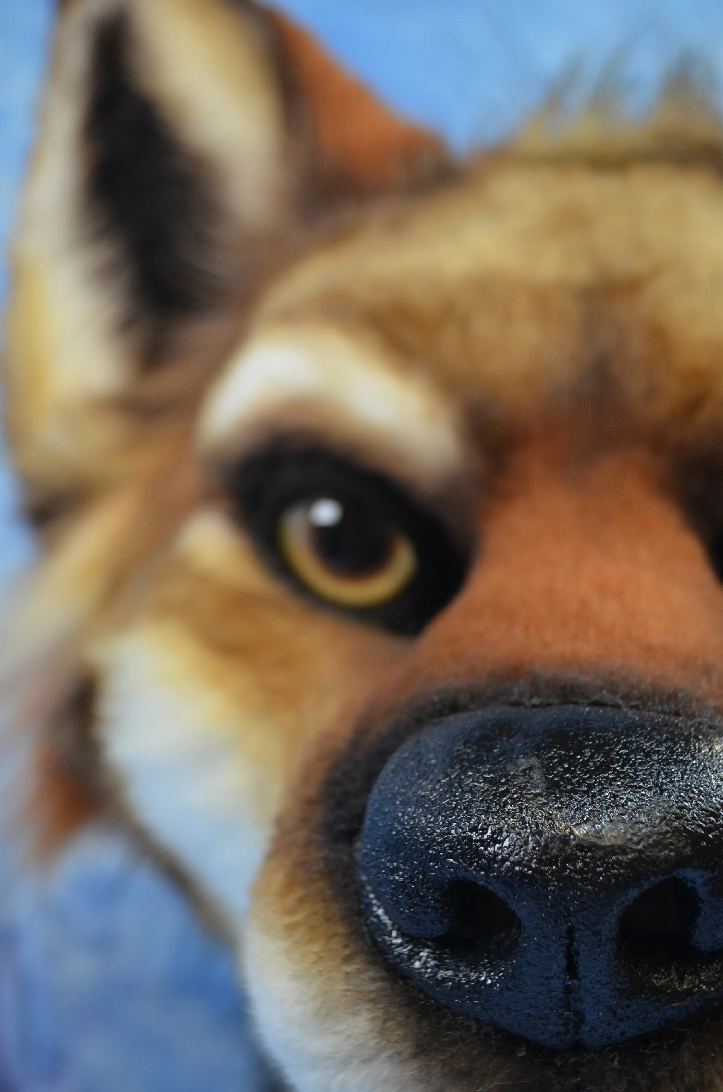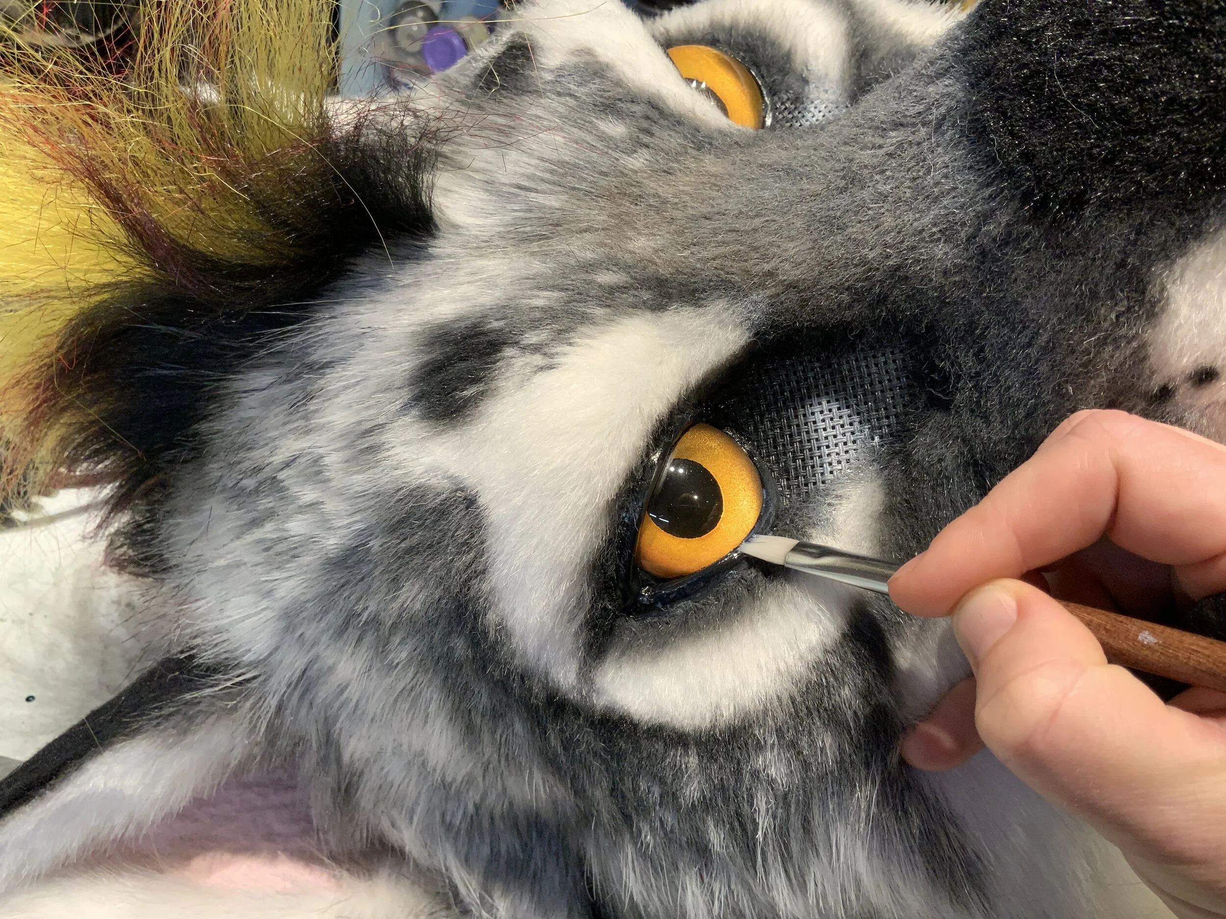 The fur is trimmed and then airbrushed. Eye mesh is added (blackened on the inside to reduce glare) and then also painted to match the fur.